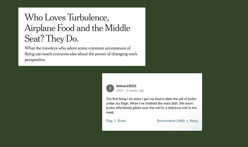 Turbulence doesn’t bother me as it used to, after a wonderful woman sitting next to me on my first solo international flight told me that it was just “nature’s rocking chair,” but I wouldn’t say it’s my preferred way to travel through the air either. There is family lore that we were on a tiny plane heading to my cousin's bar mitzvah in West Virginia, and as we made our way through the Appalachian airspace, climbing and falling in equal measure, that my mother and I were huddled up together, and my dad and my sister couldn’t get enough. I don’t like roller coasters or anything of the like. According to a New York Times article, some folks, like my 3-year-old sister, love it. Another thing folks purport to love in this article? Airplane food. While I love the pomp and circumstance of airplane food in a premium class, I wouldn’t say I love the food. One thing I do love, however, is a comment on this article about how to make your airplane bread more enjoyable by sliding the ice cold puck of butter under your thigh the minute it lands on your plate so you can be sure it’s warm and malleable by the time you’re ready for it. PEAK HUMANITY.